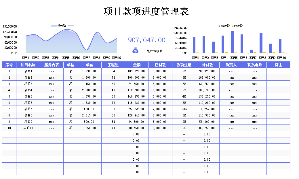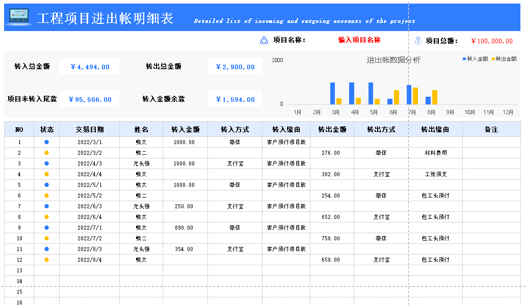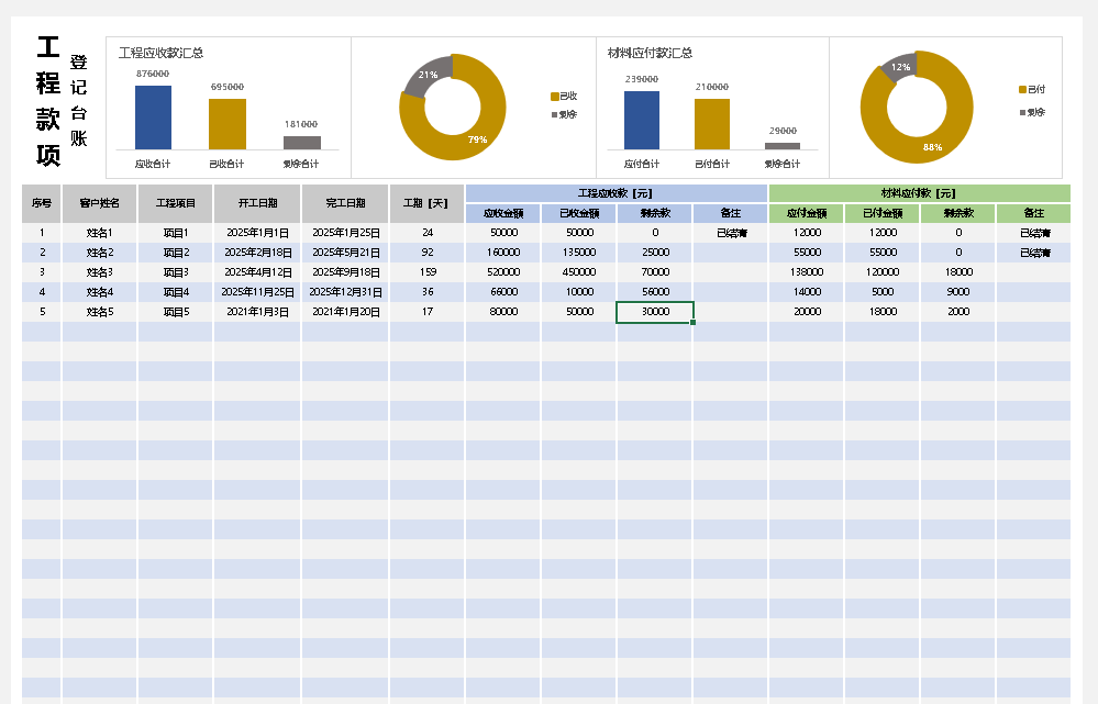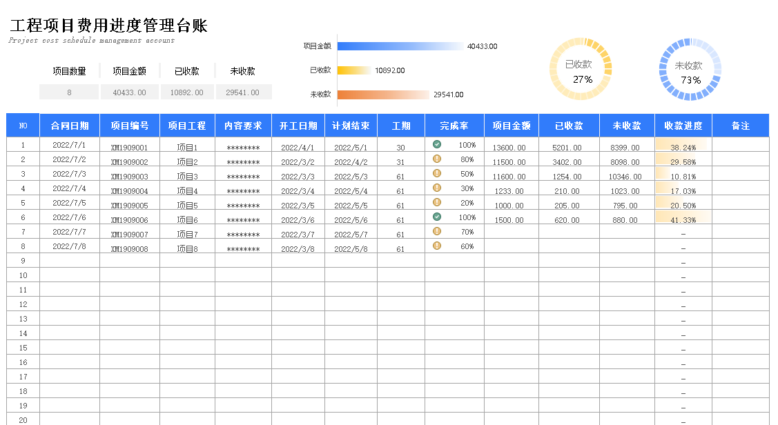 工程项目管理回款登记台账Excel表格模板 项目费用收付进度统计表