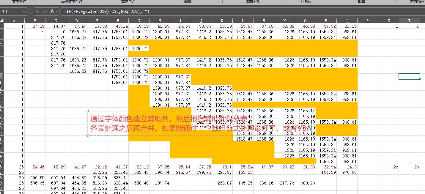 芳芳格子可以获取单元格字体颜色,依据这个拆分工作表,分别处理后再合并。最好还是VBA吧