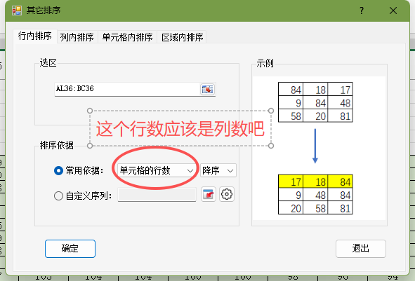 高级排序----其它排序----行内排序 ----常用依据里的单元格行数应该是列数吧,虽然结果是正确的。