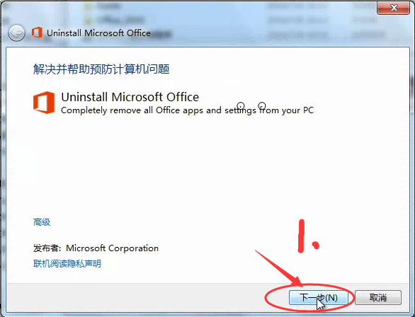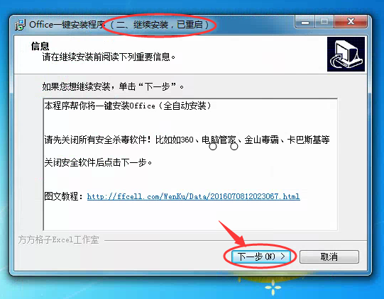 双击运行文件夹中的“Office一键安装程序”。界面如下图,此时请确认关闭了所有的安全杀毒软件,然后点击下一步。