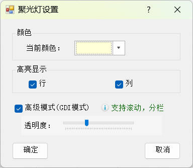 开启高级模式,可以调整聚光灯透明度,不开启则目标单元格也会填充颜色