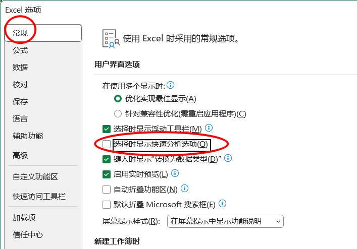 多选区域不显示聚光灯解决方法:在excel内点击文件>选项>常规>取消勾选 选择时显示快速分析选项>点击确定
