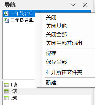 右键点击导航栏工作簿列表,可以关闭相关工作簿、快速保存工作簿、快速打开工作簿所在文件夹以及直接新建工作簿