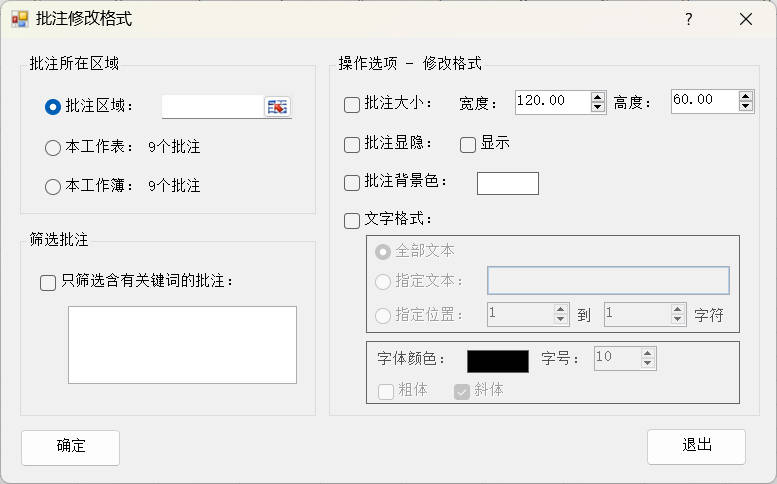 批注支持选择指定区域或当前工作簿、工作表;可以全部修改或指定关键词修改;