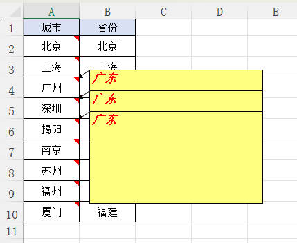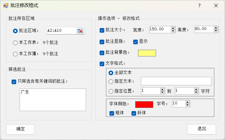 2.选择批注所在区域A2:A10,筛选含有关键词的批注:广东;设置批注大小为宽150 高80,批注显隐勾选显示,背景色黄色,文字格式为全部文本字体红色、字号10号,加粗、斜体。然后点击确定按钮