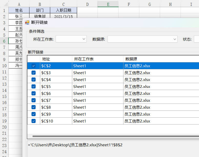 提示:如果需要筛选指定工作表和指定数据来源,在条件筛选里选择,也支持筛选链接状态;不筛选默认全部;