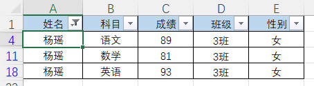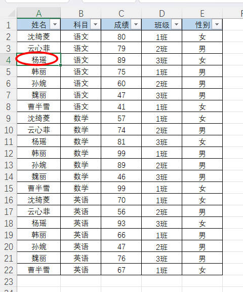 1.选择需要筛选的数据单元格A4“杨瑶”