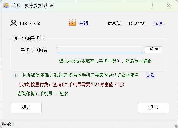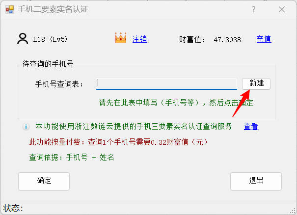 本功能按量付费,查询一个手机号需要0.32财富值