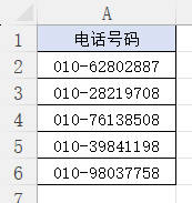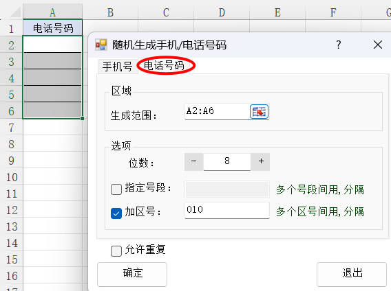 1.选择功能的第二个选项卡 电话号码,选择生成范围A2:A6,位数8位,勾选指定区号,输入010,然后点击确定按钮