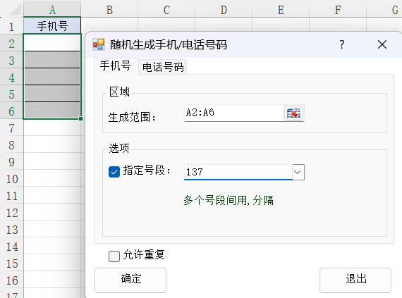 2.选择生成范围A2:A6,勾选指定号段,输入137,然后点击确定按钮