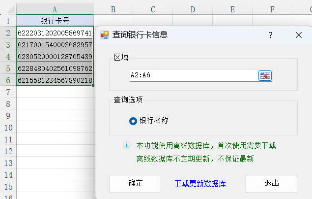 2.选择需查询的卡号区域A2:A6),查询选项默认勾选 “银行名称”,然后点击确定按钮