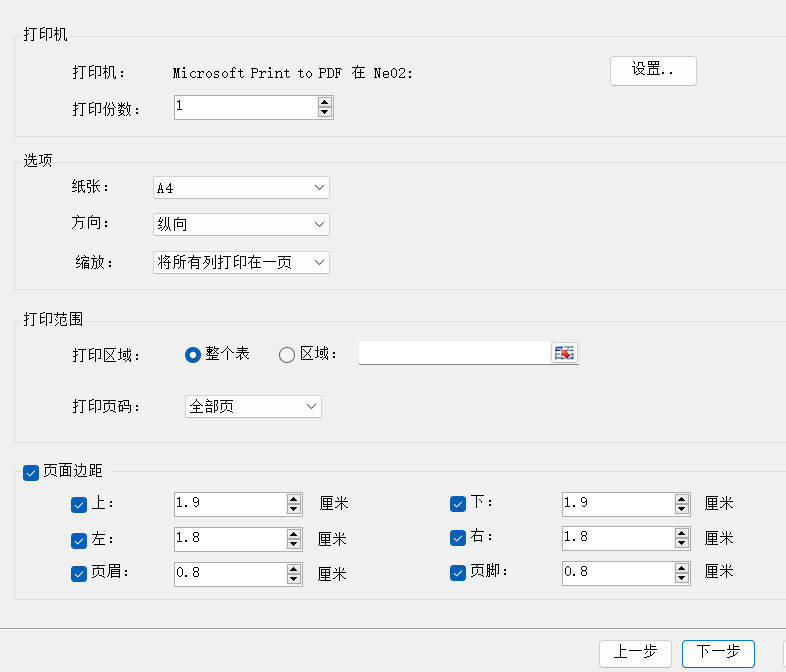 4.设置打印机、打印份数、打印区域、页边距等打印参数,然后点击下一步按钮