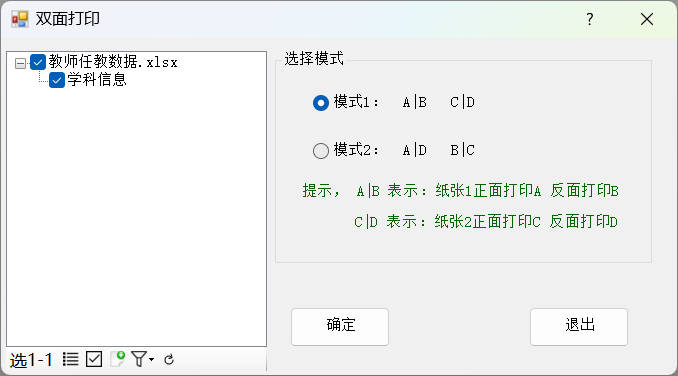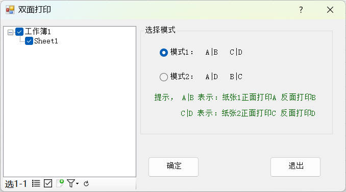 2.勾选需要打印的工作簿和工作表,选择模式1打印(纵向打印,即按长边翻转),然后点击确定按钮