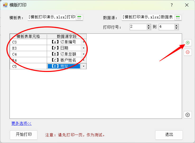 3.点击右侧的添加按钮,选择模版表中需要填写的单元格,然后设置对应的数据源字段(如C3单元格对应填写的是字段订单编号的内容),设置完成后点击开始打印按钮