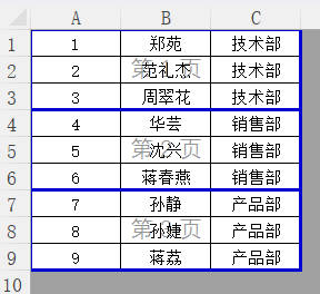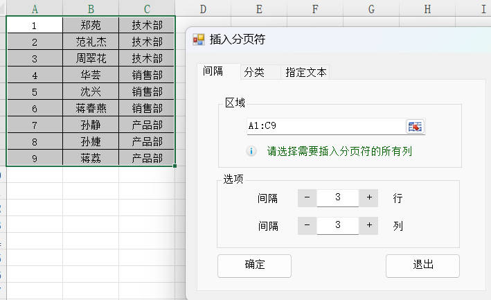 2.选择需要插入分页符的区域A1:C9,设置间隔3行3列插入分页符,然后点击确定按钮