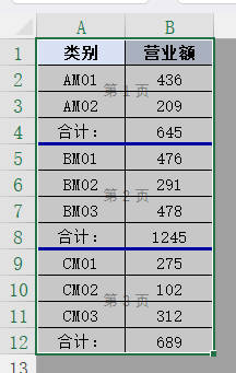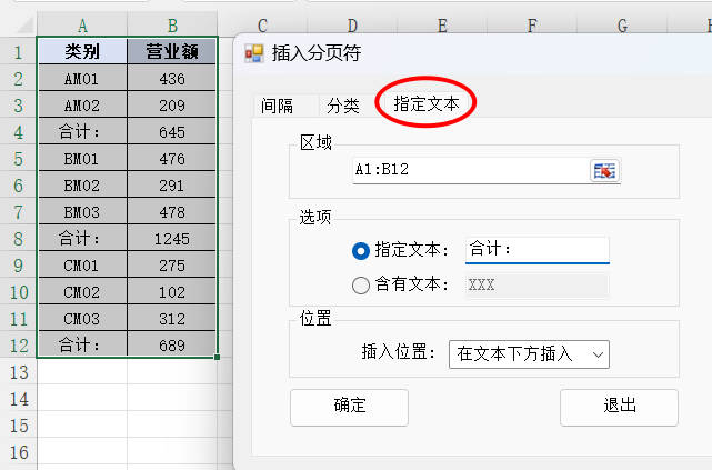 1.选择功能的第三个选项卡 指定文本,选择需要插入分页符的区域A1:B12,在指定文本“合计:”下方插入分页符,然后点击确定按钮