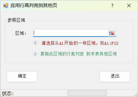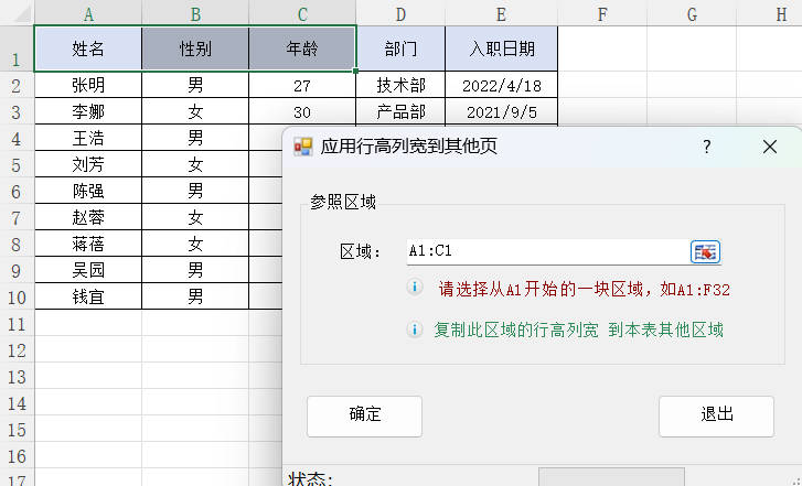2.选择参照区域A1:C1,复制此区域的行高列宽到其他区域,然后点击确定按钮