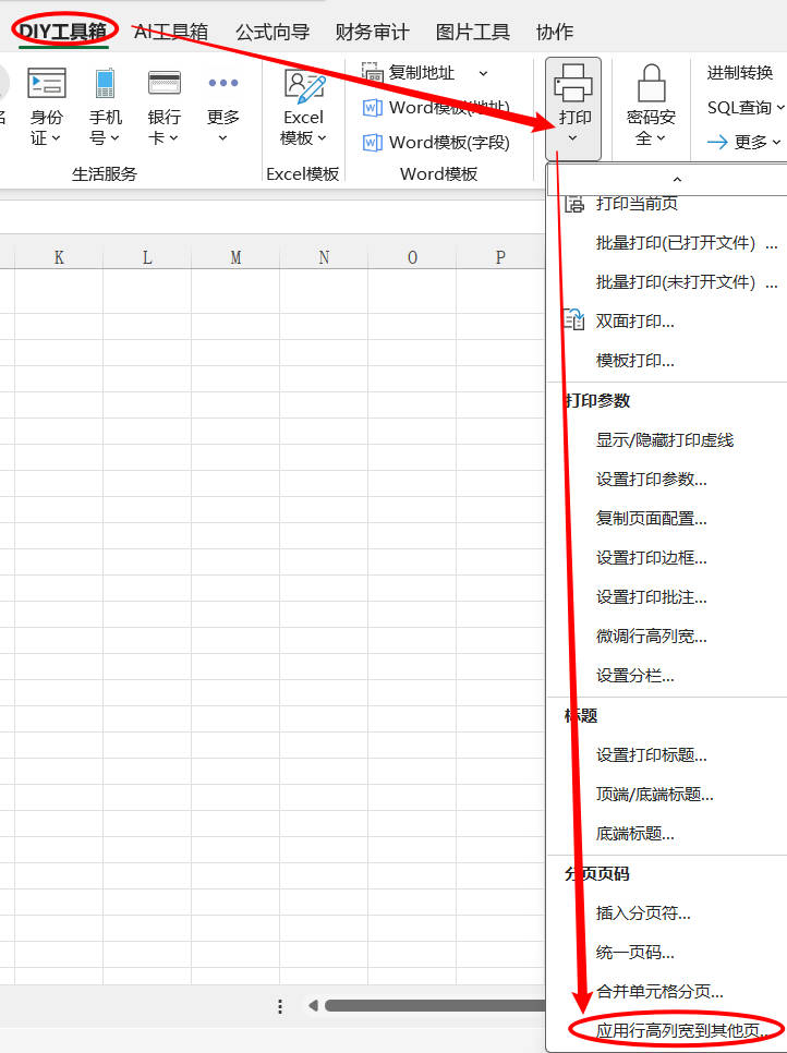 1.点击 DIY 工具箱 > 打印 > 应用行高列宽到其他页…