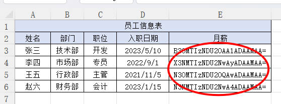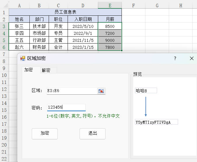 2.选择需要加密的区域E3:E6,输入密码:123456,然后点击加密按钮