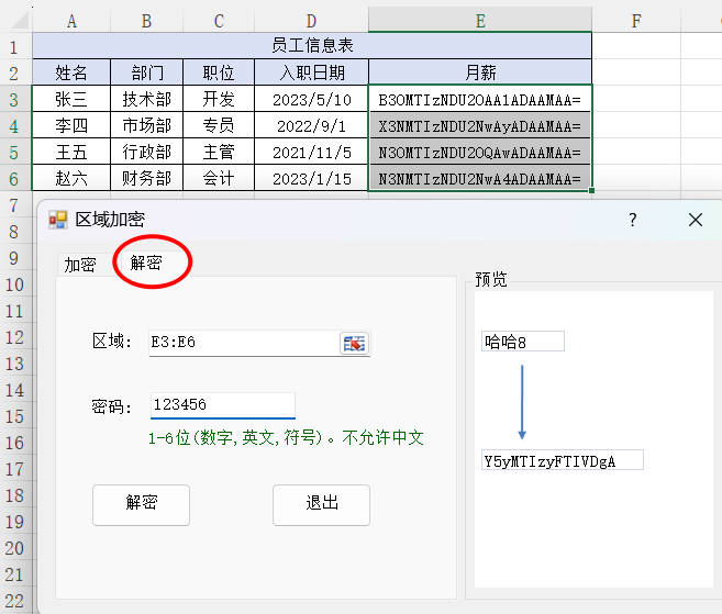1.选择功能的第二个选项卡 解密,选择需要解密的区域E3:E6,输入密码:123456,然后点击解密按钮