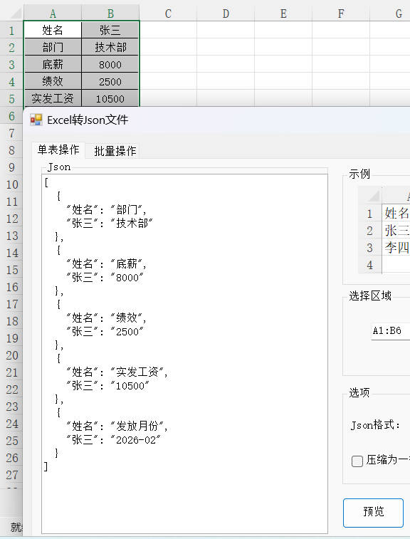 2.选择需要转换的数据区域A1:B6,Json格式选择对象数组,然后点击预览按钮