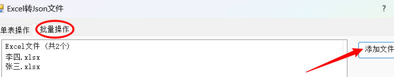 1.选择功能的第二个选项卡 批量操作,点击功能右侧的添加文件按钮,选择需要转换的Excel文件,保存路径选择默认桌面路径,Json格式选择对象数组,然后点击确定按钮