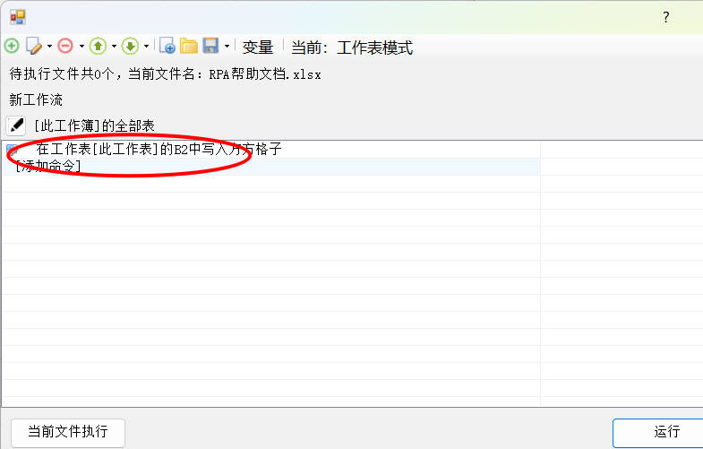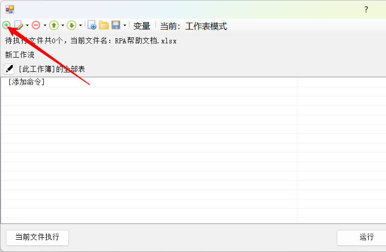 3.返回功能界面,将显示添加的命令,然后点击当前文件执行按钮