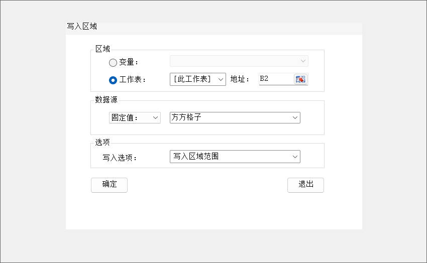 2.点击新增命令按钮,选择写入区域命令,设置工作表地址B单元格,数据源选择固定值:方方格子,写入选项选择写入区域范围,然后点击确定按钮