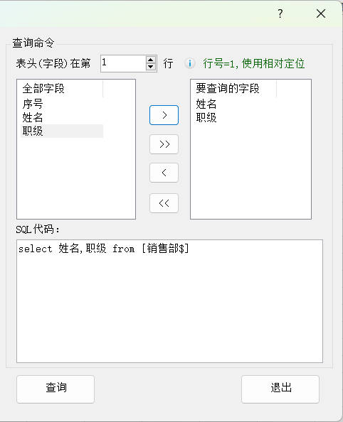 2.数据源选择当前打开的工作簿的全部表,查询命令设置表头在第1行,从左侧自动获取的字段中添加要查询的字段姓名和职级,添加后会自动生成SQL代码,然后点击查询按钮