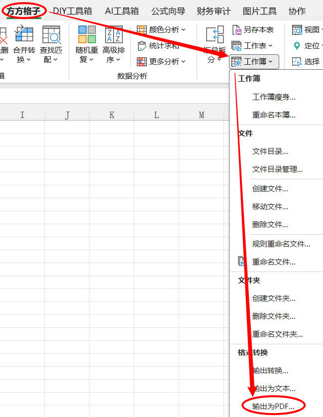 1.点击 方方格子>工作表> 工作簿>输出为PDF…
