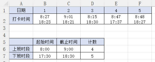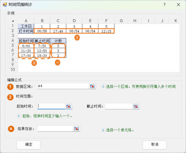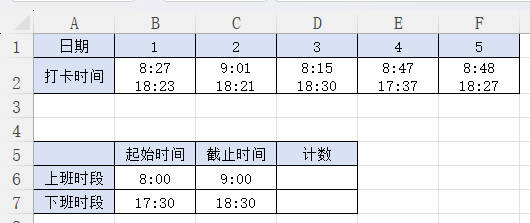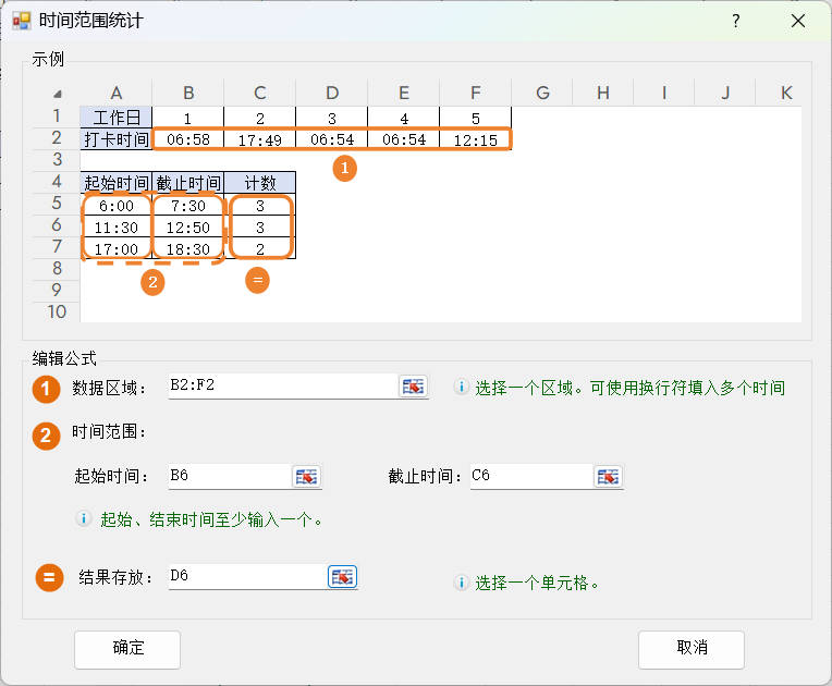 2.选择数据区域B2:F2,上班时段时间范围设置起始时间B6,截止时间C6,结果存放在D6单元格,然后点击确定按钮。(同样按以上操作,设置下班时段范围,获取打卡计数)