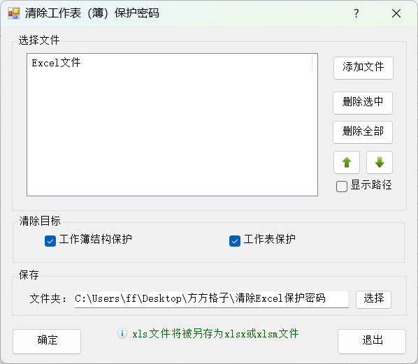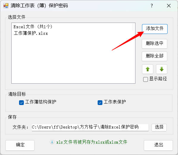 2.工作表和工作簿设置了结构保护,无法修改工作表内容和增删工作簿中的工作表。点击添加文件按钮,选择需要清除保护的Excel文件,清除目标勾选工作簿结构保护和工作表保护,保存到默认路径桌面,然后点击确定按钮