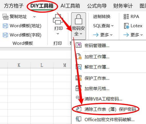 1.点击 DIY工具箱> 密码安全 > 清除工作表(簿)保护密码…