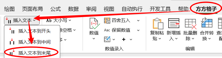 2.点击方方格子> 高级文本处理>插入文本>插入文本到末尾