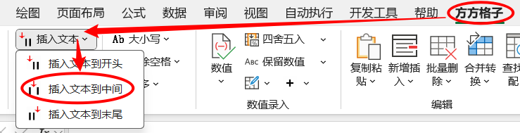 2.点击方方格子> 高级文本处理>插入文本>插入文本到中间