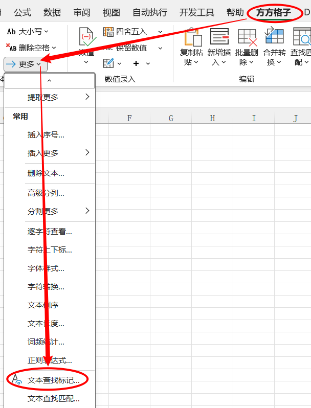 1.点击方方格子> 高级文本处理>更多>文本查找标记…