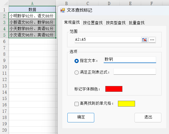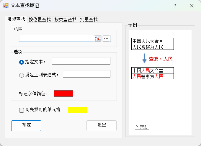 文本查找标记功能,能够按文本内容、文本位置、文本类型、批量查找,支持单表和多表模式。支持标记字体的颜色和高亮显示找到的单元格,便于直观识别关键信息。