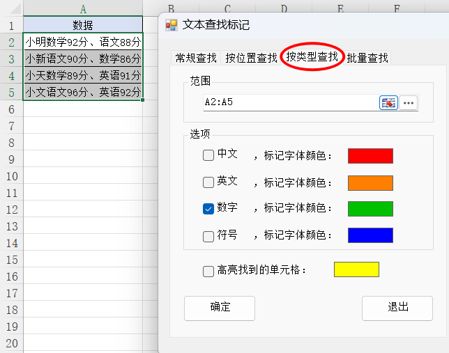 1. 选择功能的第三个选项卡 按类型查找,范围选择A2:A5,勾选数字,标记字体颜色绿色,然后点击确定按钮