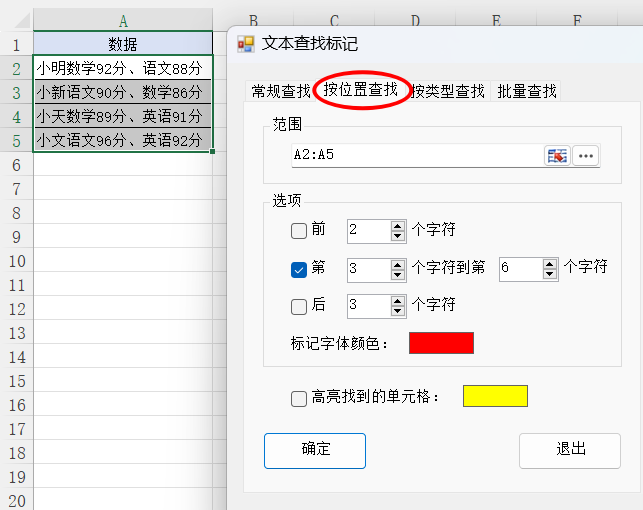 1. 选择功能的第二个选项卡 按位置查找,范围选择A2:A5,设置第3个字符到第6个字符,标记字体颜色红色,然后点击确定按钮