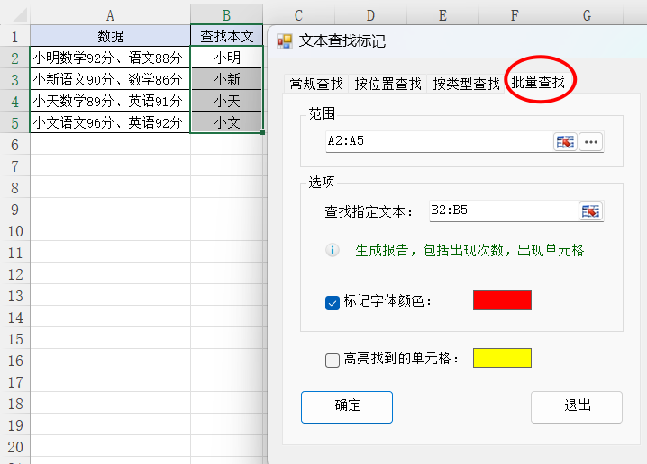 1. 选择功能的第四个选项卡 批量查找,范围选择A2:A5,查找指定文本选择区域B2:B5,勾,标记字体颜色红色,然后点击确定按钮