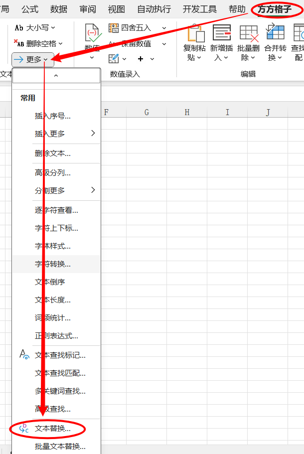 1.点击方方格子> 高级文本处理>更多>文本替换…