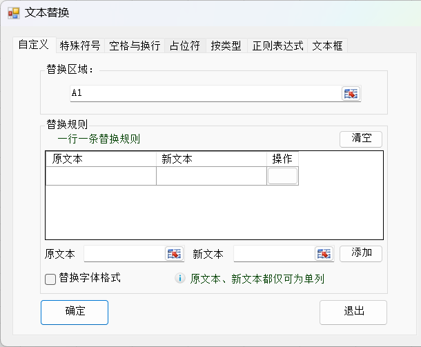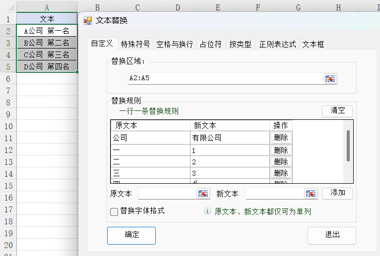 提示:支持手动输入替换规则,也支持从单元格内选取文本替换;