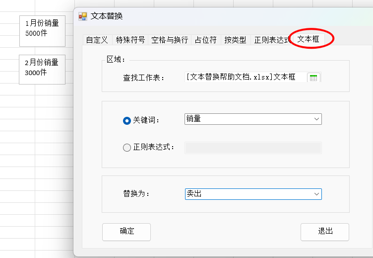 1.选择功能的第七个选项卡 文本框,选择需要查找的工作表,查找关键词:销量,替换为指定文本:卖出,然后点击确定按钮