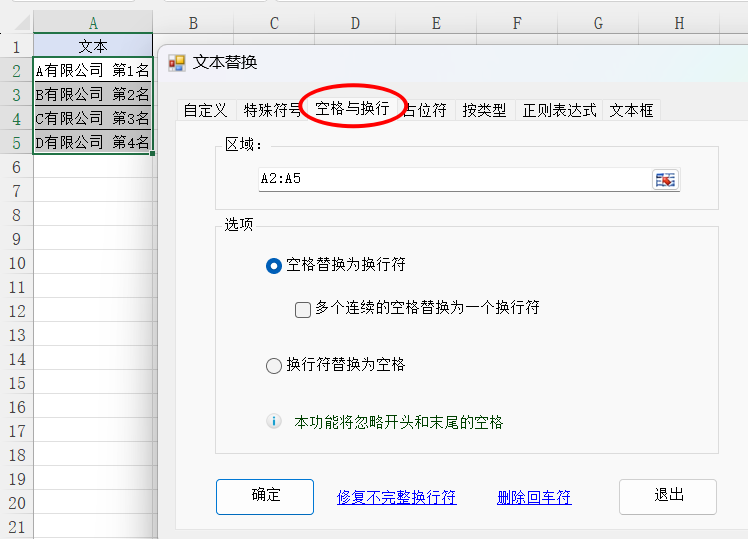 1.选择功能的第三个选项卡 空格与换行,区域选择A2:A5,选择空格替换为换行符,然后点击确定按钮