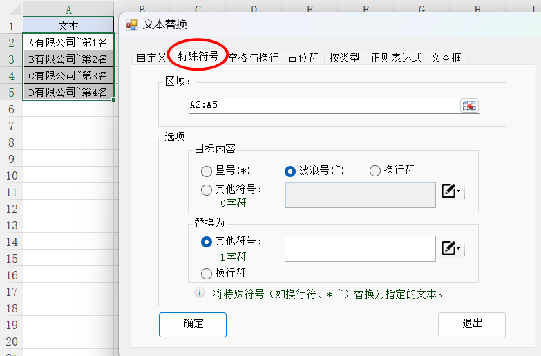 1.选择功能的第二个选项卡 特殊符号,区域选择A2:A5,目标内容选择波浪号,替换为其他字符:“-”,然后点击确定按钮