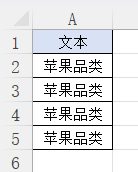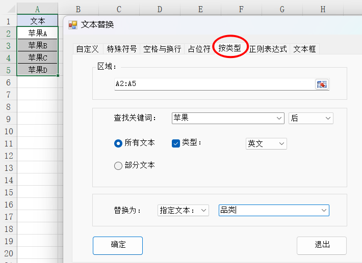1.选择功能的第五个选项卡 按类型,区域选择A2:A5,查找关键词:苹果 后的所有文本,类型选择英文,替换为指定文本:品类,然后点击确定按钮