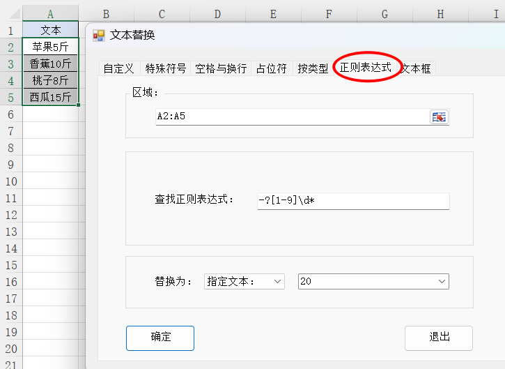 1.选择功能的第六个选项卡 按类型,区域选择A2:A5,查找整数的正则表达式:-?[1-9]\d*,替换为指定文本:20,然后点击确定按钮