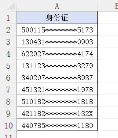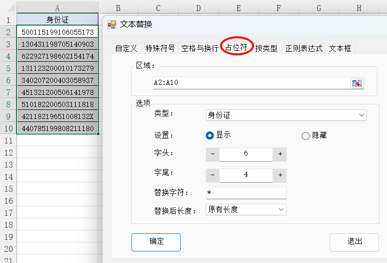 1.选择功能的第四个选项卡 占位符,区域选择A2:A10,选择类型:身份证,设置显示字头6字符,字尾4字符,替换字符*,替换后长度:原有长度,然后点击确定按钮