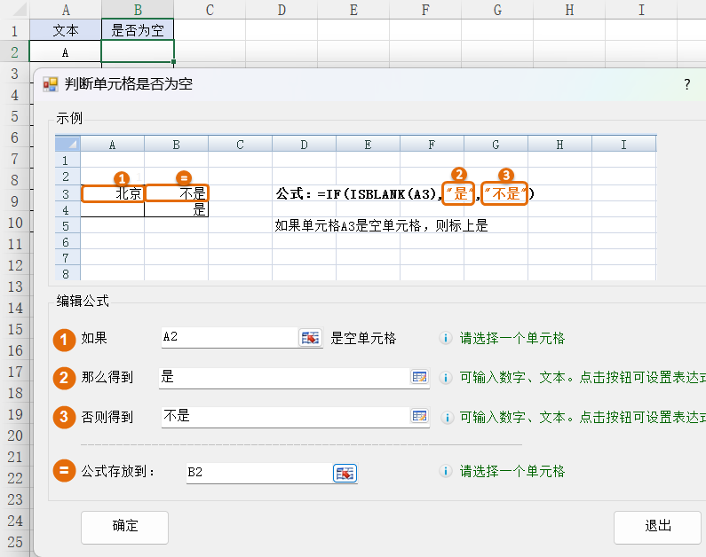 2. 选择一个需要判断的单元格A2,是空单元格得到 是,否则得到 不是,公式存放到单元格B2,然后点击确定按钮
