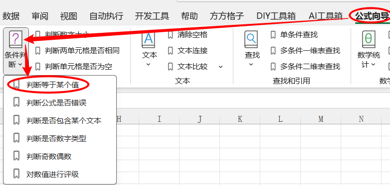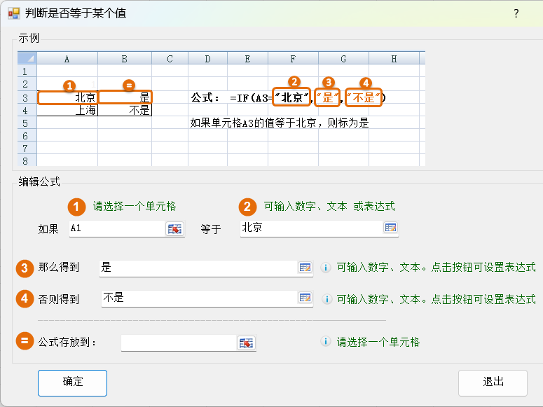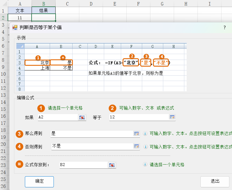 判断等于某个值功能,将目标数据与设定值直接比较,判断二者是否完全相等,返回结果并生成公式。